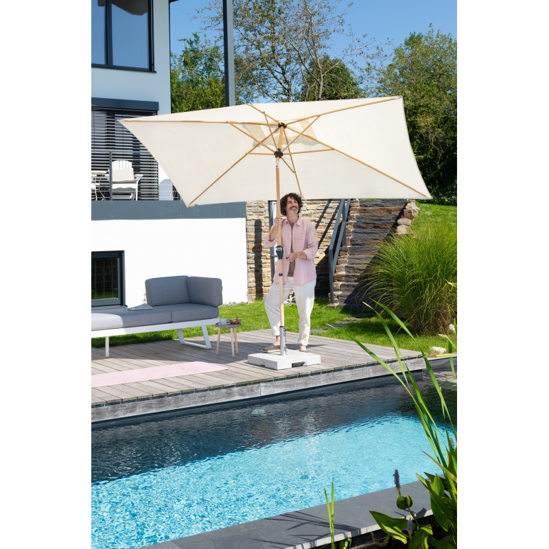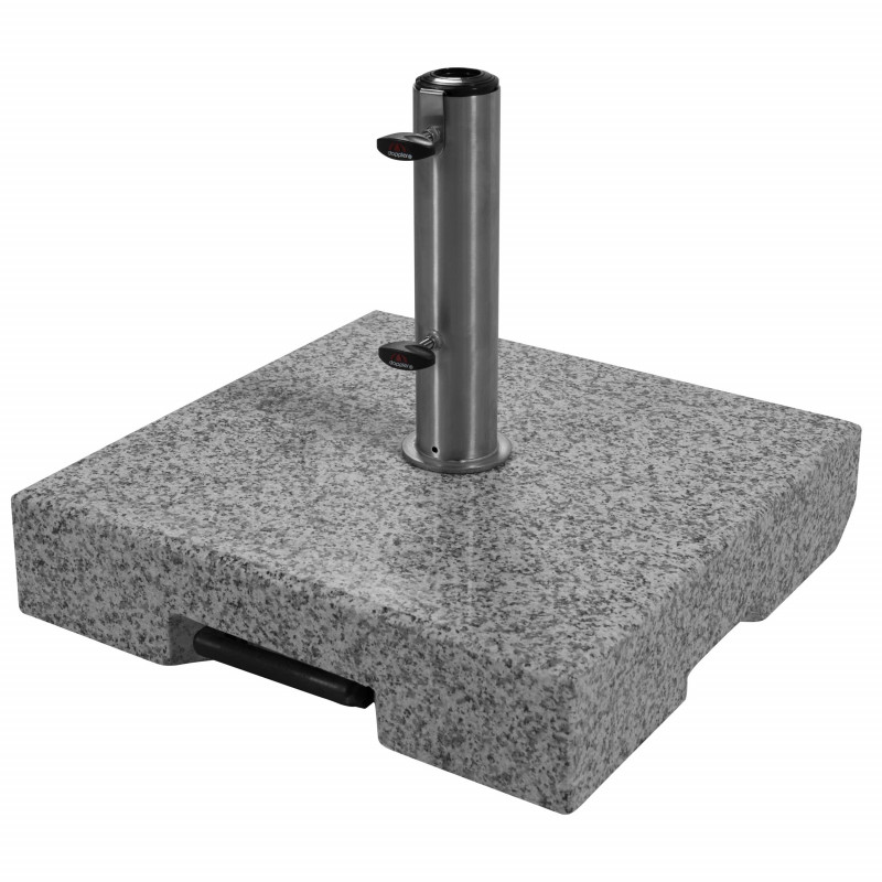 Ten jasnoszary stojak z polerowanego granitu jest wyposażony w 2 kółka i wysuwany uchwyt ułatwiający przemieszczanie. Parasol jest zakotwiczony w rurze ze stali nierdzewnej i zabezpieczony dwiema śrubami blokującymi. Rura ma kilka pierścieni redukcyjnych, które umożliwiają stosowanie tyczek o średnicy 32-60 mm. Dzięki wadze 70 kg zapewniona jest bezpieczna stabilność nawet średnich parasoli centralnych o średnicy dachu do 350 cm.