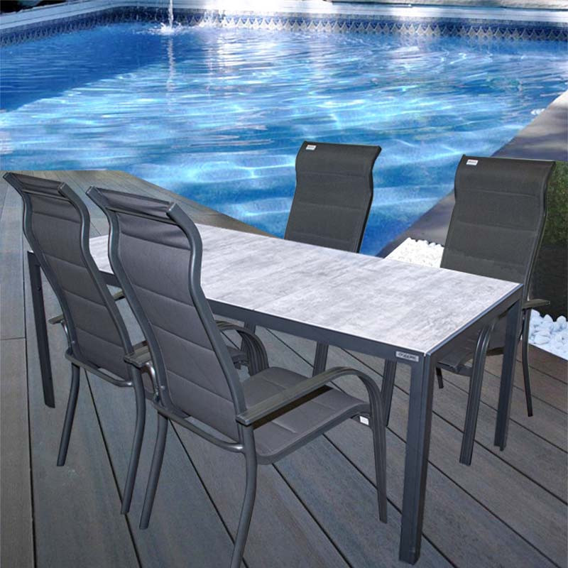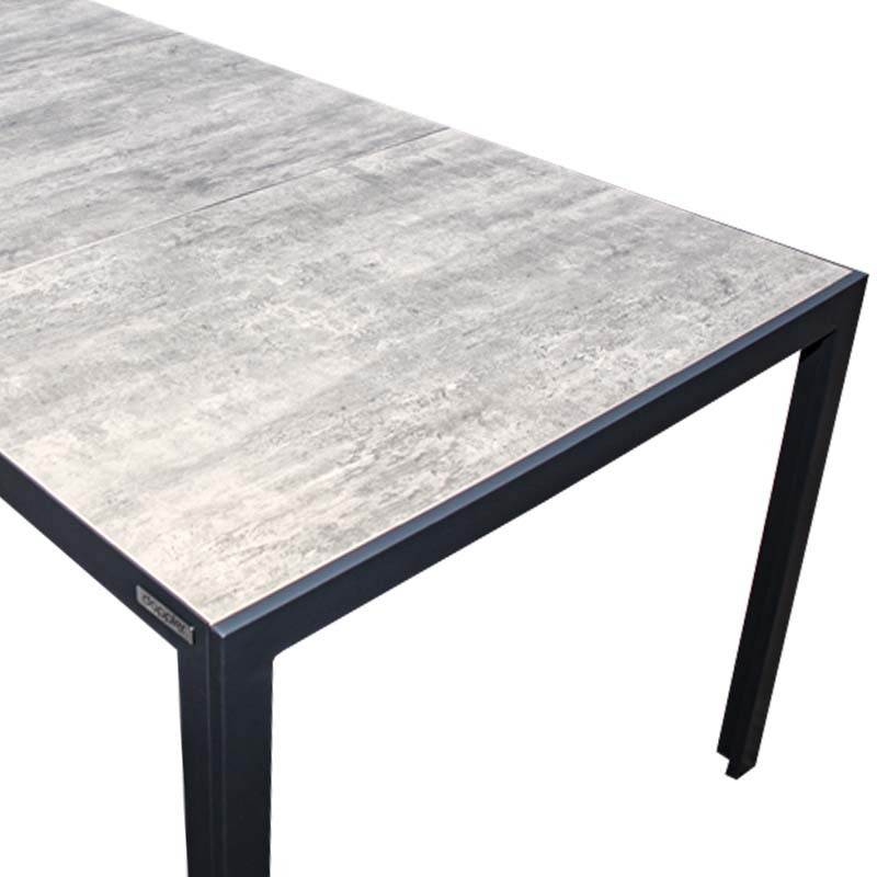 W skład zestawu wchodzi również stół Bergamo o wymiarach 180 x 90 cm. Stół ma wytrzymałą aluminiową konstrukcję pokrytą antracytową powłoką proszkową, która chroni stół przed korozją i znacznie wydłuża jego żywotność. Ogromną zaletą stołu jest również jego trwały ceramiczny blat w pięknym wyżarzanym szarym kolorze.