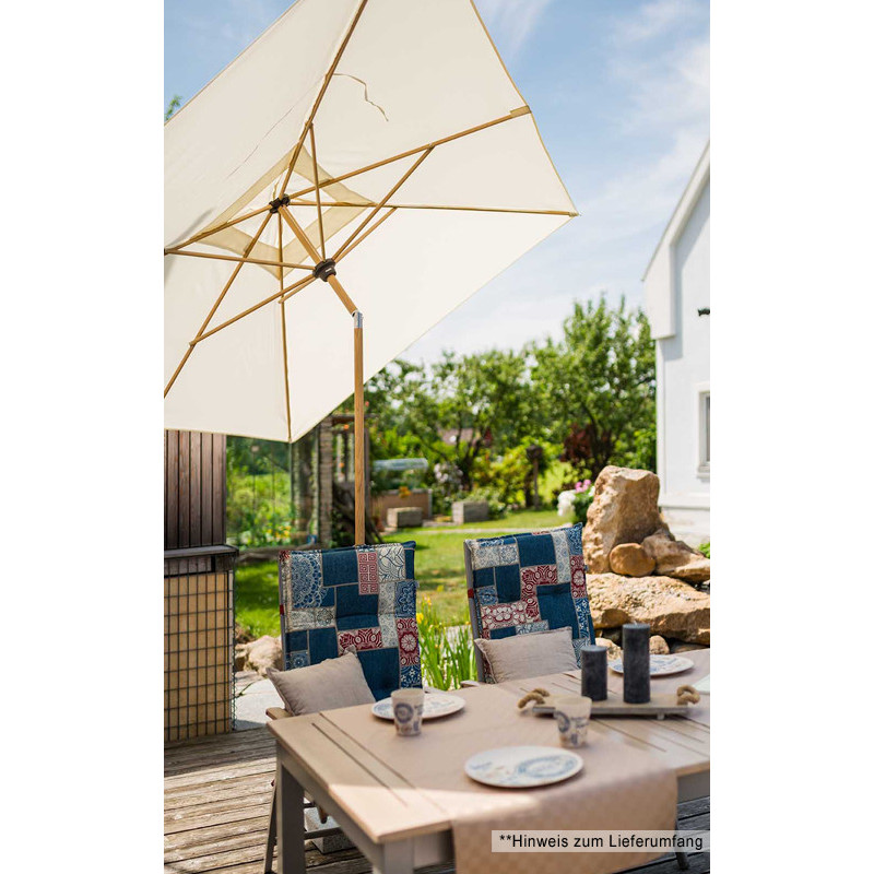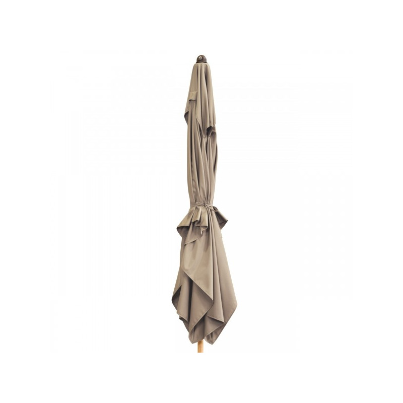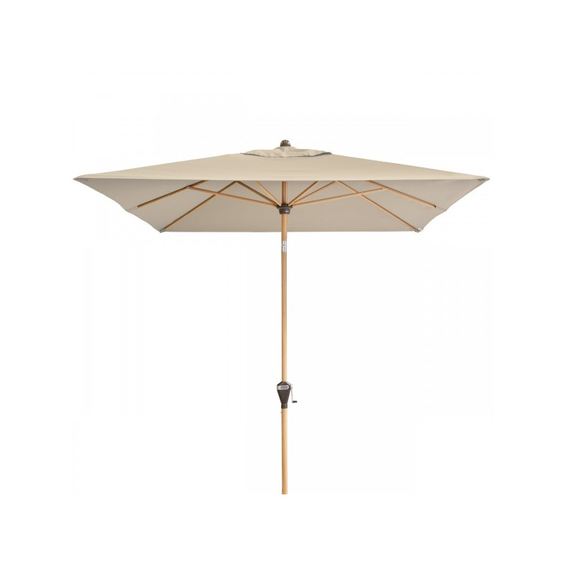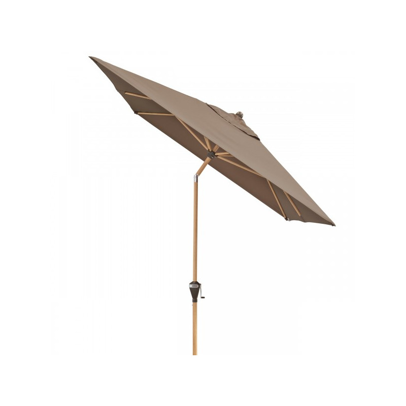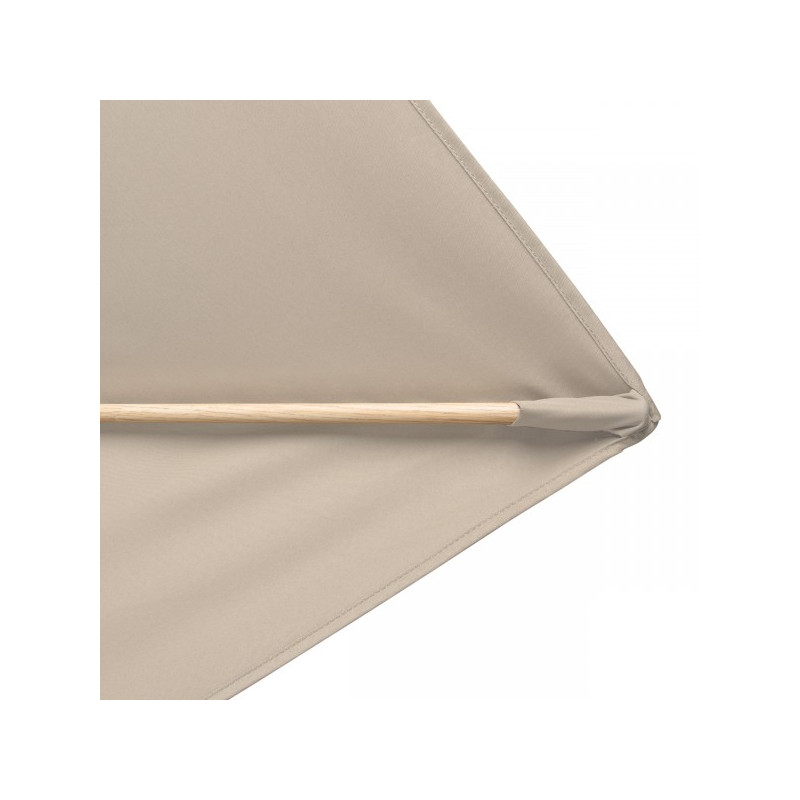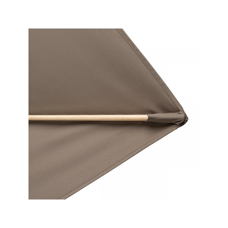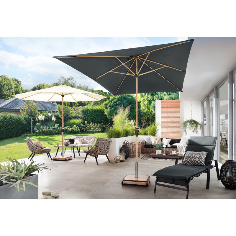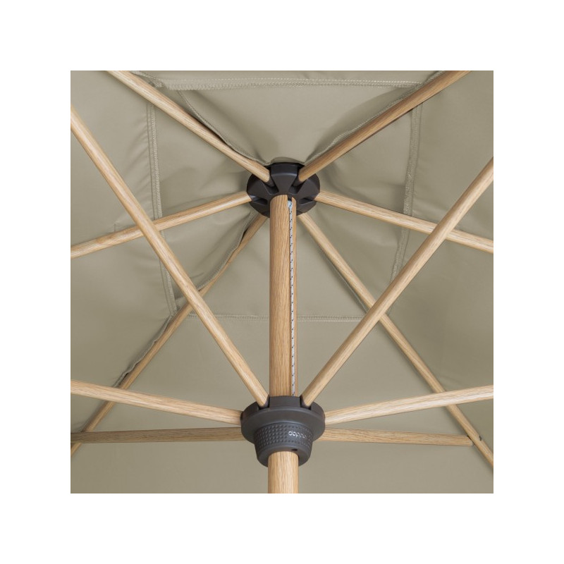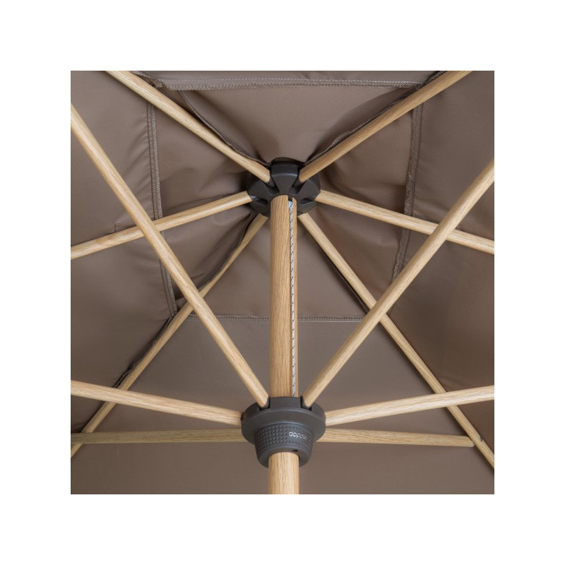 Ten parasol ucieszy miłośników drewna. Dzięki ponadczasowemu wyglądowi z imitacji drewna jesionowego i pokryciu w ciepłych, naturalnych kolorach, nadaje się do niemal każdego balkonu, tarasu lub ogrodu. Parasol oferuje przyjazną dla użytkownika obsługę za pomocą korby. Ma możliwość przechylenia do 3 pozycji. Rama parasola wykonana jest z wysokiej jakości aluminium, a rozpórki ze stali, co zapewnia długą żywotność. Czasza parasola ma doskonałą ochronę przed promieniowaniem UV 80+. Dzięki otworowi wentylacyjnemu w dachu, gorące letnie powietrze nie gromadzi się pod parasolem.