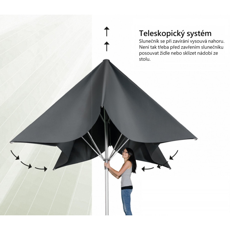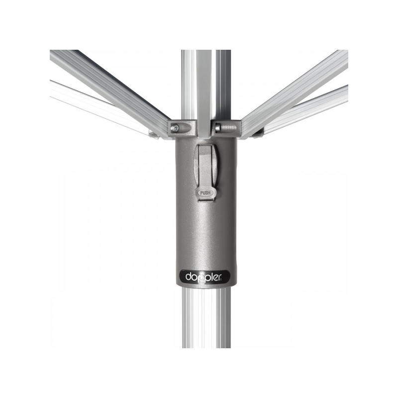 Profesjonalny masywny parasol z wygodnym otwieraniem za pomocą automatycznego systemu teleskopowego Doppler, który umożliwia łatwe otwieranie parasola jedną ręką. Solidna konstrukcja parasola wykonana jest z profilowanego aluminium, a wszystkie połączenia są skręcane.