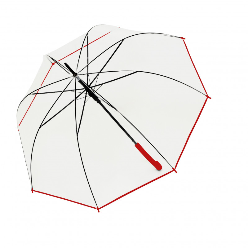 Przezroczysty damski parasol z trzonkiem jest wygodny w dłoni, stabilny i wytrzymały stalowy stelaż. Solidna wiatroszczelna konstrukcja w kolorze czarnym. Duży przezroczysty dach. Czerwone wykończenie.