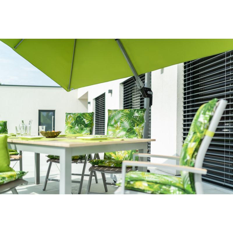 Poduszka z wysokim oparciem do mebli ogrodowych z serii LIVING jest w wersji obszytej, z 4-krotnym przeszyciem pierścieniowym w oparciu. Mocowanie odbywa się za pomocą przesuwanej klamry. Dzięki klamrze można dopasować rozmiar do wielkości i rodzaju krzesła, klamra jest zamocowana na stałe i nie wysuwa się. Poduszka siedziska jest mocowana za pomocą dwóch sznurowadeł w zagięciu poduszki. Grubość poduszki jest optymalna dla wszystkich typów krzeseł. Konstrukcja nadaje się również do wymagających warunków kawiarni, ogrodów i restauracji. Pokrowca nie można zdjąć .