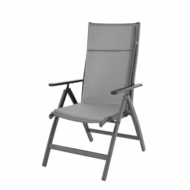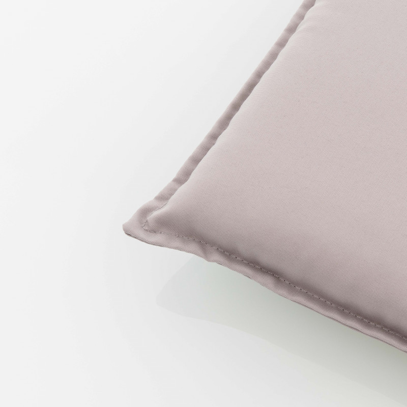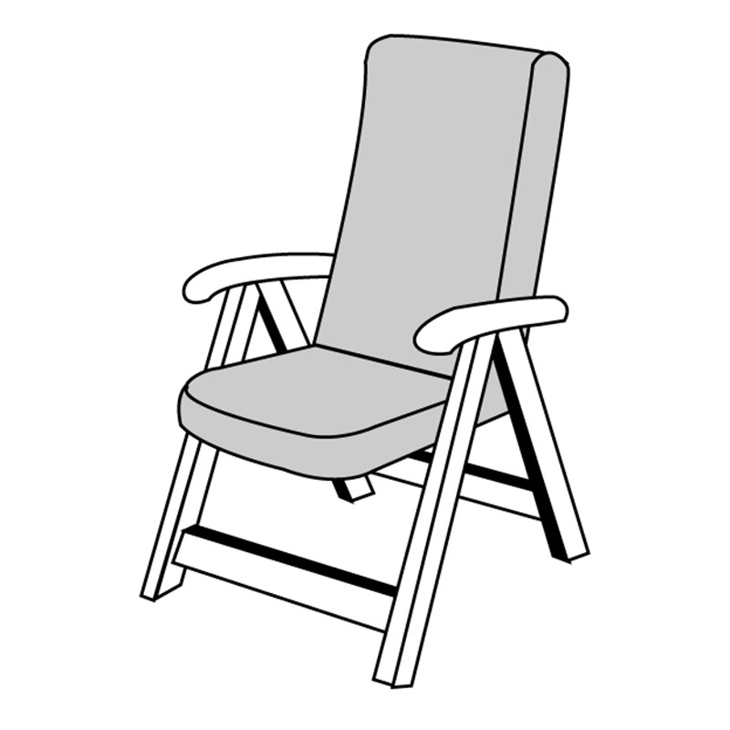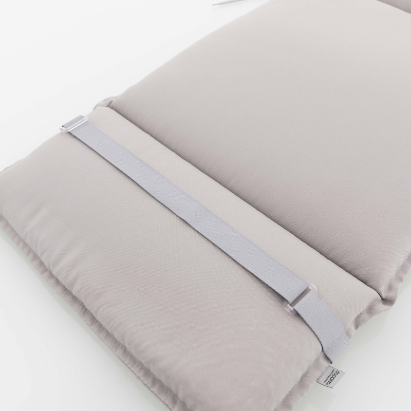 Poduszka z wysokimoparciem do mebli ogrodowych z serii HIT UNI w wersji z obszytą krawędzią, zszyta 1x w oparciu. Mocowanie odbywa się za pomocą przesuwanego zapięcia. Dzięki klamrze można dopasować rozmiar do wielkości i rodzaju krzesła, klamra jest zamocowana na stałe i nie wysuwa się. Poduszka siedziska jest mocowana za pomocą dwóch sznurowadeł w zagięciu poduszki. Pokrowca nie można zdjąć.