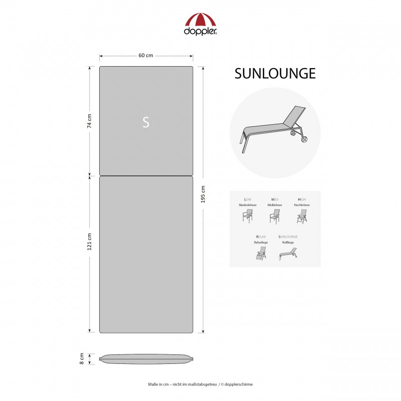 Poduszka doszezlonga ogrodowego z serii MOTION XL ma wyjątkowo grube siedzisko z oparciem, które jest elegancko zaprojektowane z obrębionym, przeszytym 4x szwem pierścieniowym w oparciu. Mocowanie odbywa się za pomocą przesuwanej klamry. Dzięki klamrze można dostosować rozmiar do rozmiaru i rodzaju krzesła, klamra jest mocna i nie wyciąga się. Poduszka siedziska jest mocowana za pomocą dwóch sznurowadeł w zagięciu poduszki. Czasza parasola jest pokryty specjalną impregnacją chroniącą przed pleśnią i brud em. Dzięki tej impregnacji brud pozostaje na powierzchni impregnatu i nie dostaje się do poszczególnych włókien pokrowca, dzięki czemu tkaninę można łatwo wyczyścić wilgotną szmatką lub gąbką , a poduszka jest bardziej odporna na wilgoć. Należy pamiętać, że poduszka nie jest wodoodporna. Pokrowca nie można zdjąć.