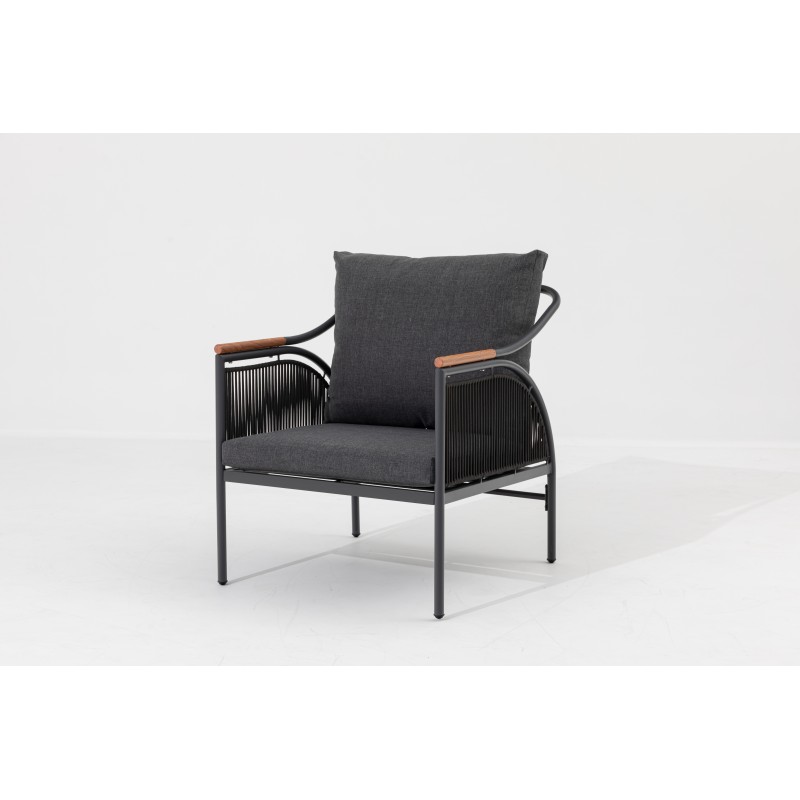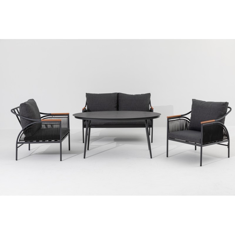 Komplet Lucca wyróżnia się eleganckimi przeszyciami po bokach , które nadają całemu kompletowi zwiewny i wyrafinowany wygląd. Stalowa rama w kolorze antracytowym gwarantuje stabilność i nowoczesny styl, a podłokietniki sofy i foteli w naturalnym odcieniu drewna tworzą przyjemny kontrast.