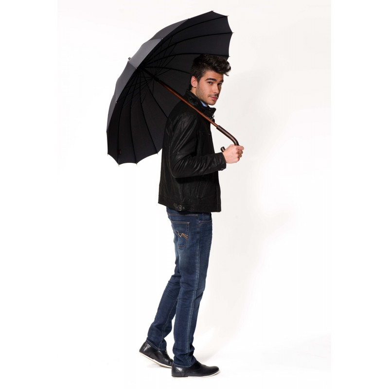 Męski parasoL. Stelaż parasola wykonany ze stali i drewna gwarantuje wytrzymałość, dzięki wysokiej jakości szesnastu drutom jest bardzo stabilny. Poliestrowe poszycie jest odporne na zmiany wilgotności i temperatury, nie kurczy się. Duży dach.
